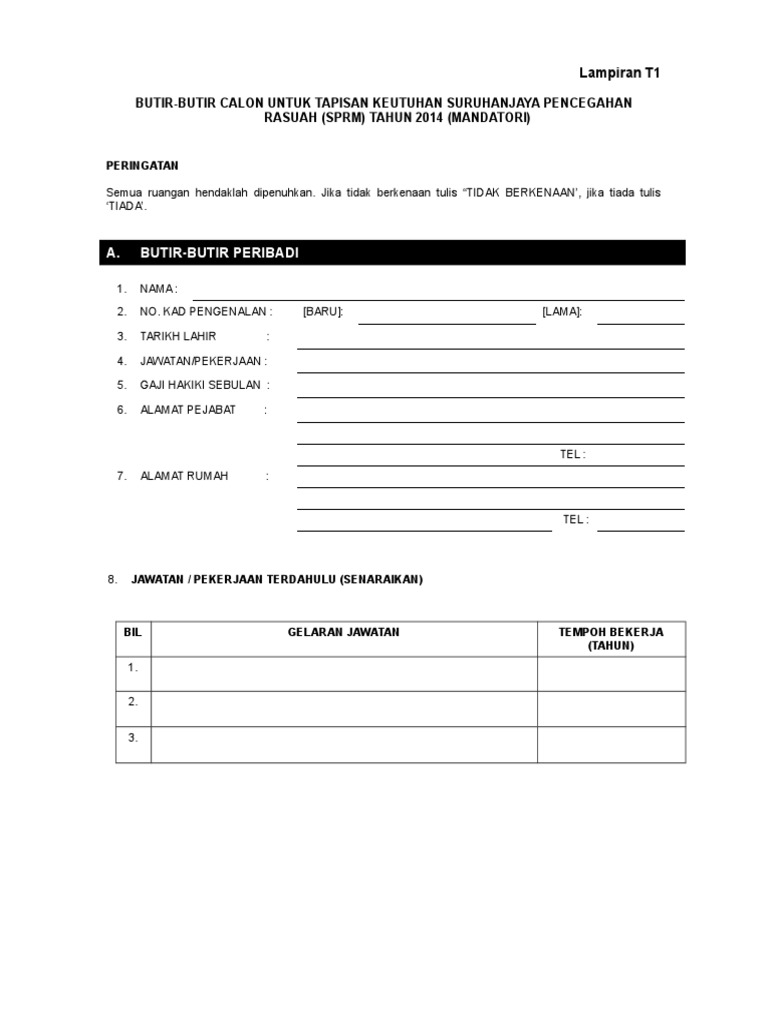 Jika tidak berkenaan tulis tidak berkenaan nama. Lampiran t1 butir butir calon untuk tapisan keutuhan suruhanjya pencegahan rasuah malaysia sprm tahun 2015 mandatori peringatan semua ruangan hendaklah dipenuhkan. Kad pengenalan 2 1 baru 2 2 lama 3. Butir butir calon untuk tapisan keutuhan.