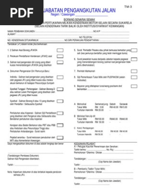 In bahasa malaysia the document is known as borang permohonan pertukaran milikan kenderaan motor secara sukarela. Senarai borang pertukaran milikan dan dokumen pengesahan sokongan. Tinggalkan satu petak kosong di antara perkataan. Bawa 2 salinan borang senarai semak permohonan pertukaran milikan motor selain secara sukarela borang tm 3.