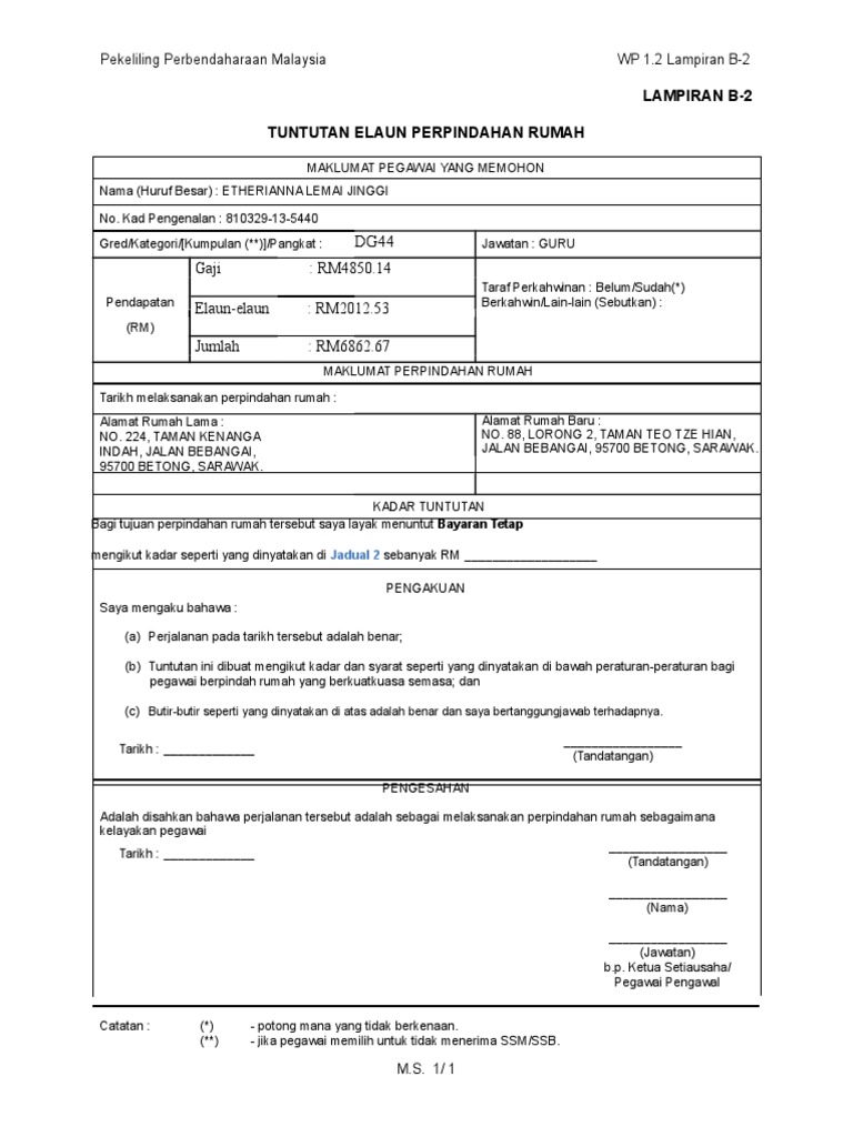 Borang tuntutan pindah rumah pertama. A perjalanan pasa tarikh tersebut adalah benar. 1 2 surat arahan masuk keluar rumah kerajaan atau surat kelulusan skim pembiayaan perumahan kerajaan. Tuntutan elaun elaun kerana perpindahan rumah. 4 2 3 perpindahan rumah yang tidak melibatkan perbelanjaan pengangkutan barang barang misalnya perpindahan rumah.