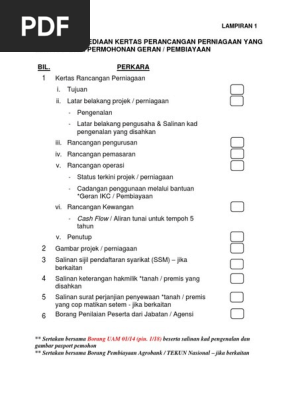 Kertas rancangan perniagaan yang lengkap rujuk panduan. Menyertakan sijil latihan kursus berkaitan projek bagi permohonan kategori projek permulaan. Kertas rancangan perniagaan yang lengkap rujuk lampiran 1. Borang uam 01 14 pin 02 18 berserta salinan kad pengenalan yang disahkan oleh pegawai jabatan agensi dan gambar berukuran passport.