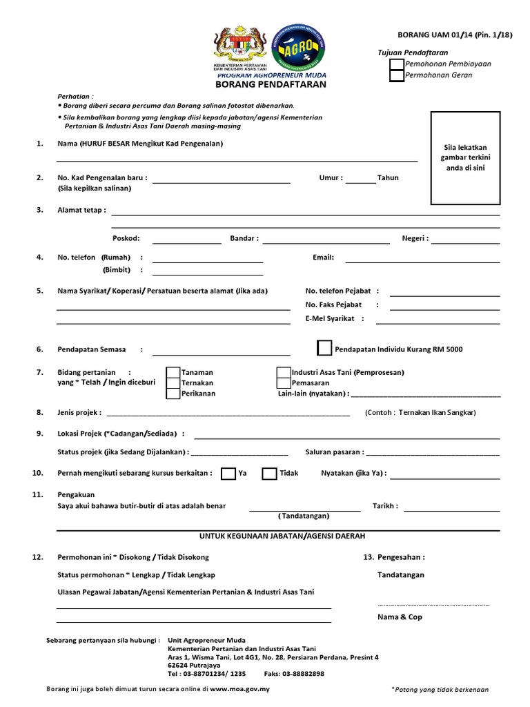 Borang uam 01 14 pin 1 18. Borang permohonan pembiayaan agrobank atau tekun nasional bagi permohonan kategori projek pengembangan atau. Senarai cadangan barangan yang dinyatakan pada borang uam 01 14 pin 02 18 perlu disertakan anggaran sebut harga. Borang uam 01 14 pin 02 18 berserta salinan kad pengenalan yang disahkan pegawai jabatan agensi dan gambar berukuran passport. Borang uam 01 14 pin 02 18 berserta salinan kad pengenalan yang disahkan oleh pegawai jabatan agensi dan gambar berukuran passport.
