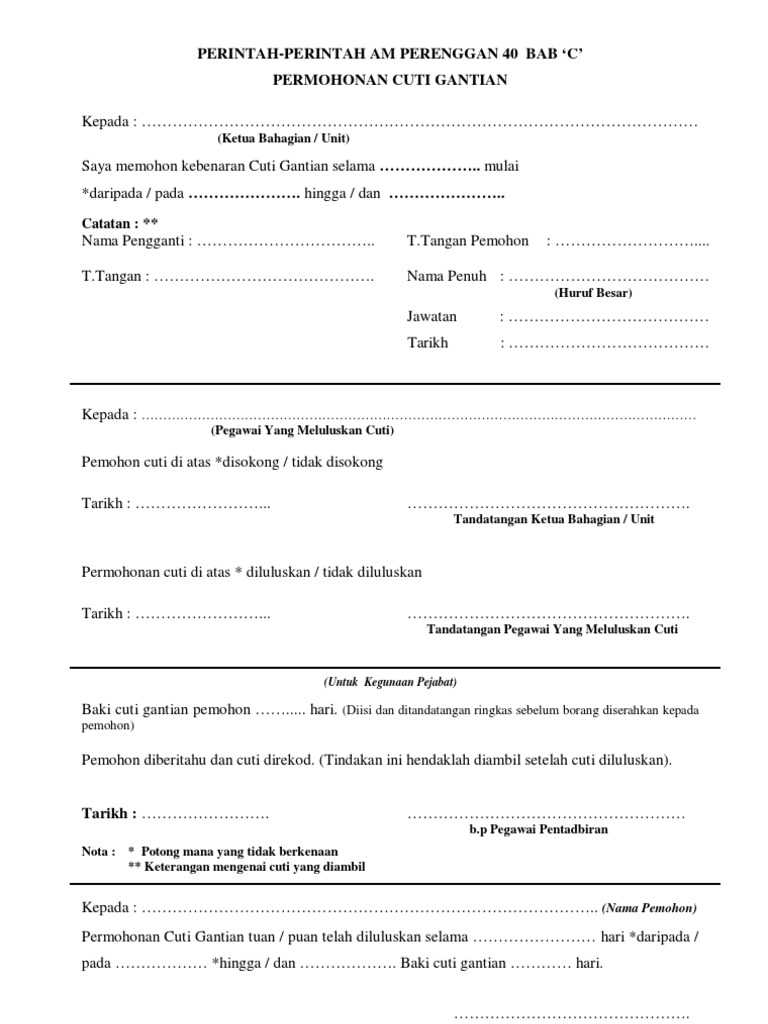 Contoh borang cuti gantian kerja lebih masa. Cuti gantian perlu mendapat kelulusan ketua bahagian dan dipohon menggunakan borang permohonan cuti gantian yang perlu dilampirkan bersama sama dengan surat arahan bertugas lebih masa salinan kad perakam waktu atur cara program jadual bertugas. 5 kelulusan cuti gantian dihadkan kepada enam 6 hari sahaja dalam tempoh sebulan. Seterusnya ikuti langkah dibawah. Borang tuntutan hendaklah dikemukakan sebelum atau pada 5 haribulan setiap bulan bagi diproses dan dibayar bersama gaji bulan berkenaan.