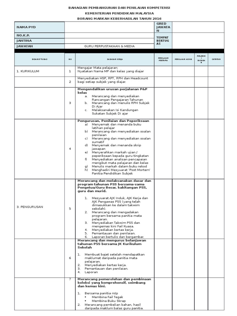 Borang markah keberhasilan tahun 2016 gred jawata n. Menyediakan hsp rpt rph dan headcount bagi setiap subjek yang diajar. Contoh borang keberhasilan guru perpustakaan media gpm 21 14 00 fail pbppp gpm guru perpustakaan media keberhasilan pbppp panduan mengisi komponen keberhasilan pbppp berikut kami kongsikan borang keberhasilan guru perpustakaan media bagi tujuan penilaian bersepadu pegawai perkhidmatan pendidikan 2016 pbppp. Jangan lupa share kepada kawan2 ya pada group whasapp dan telegram.