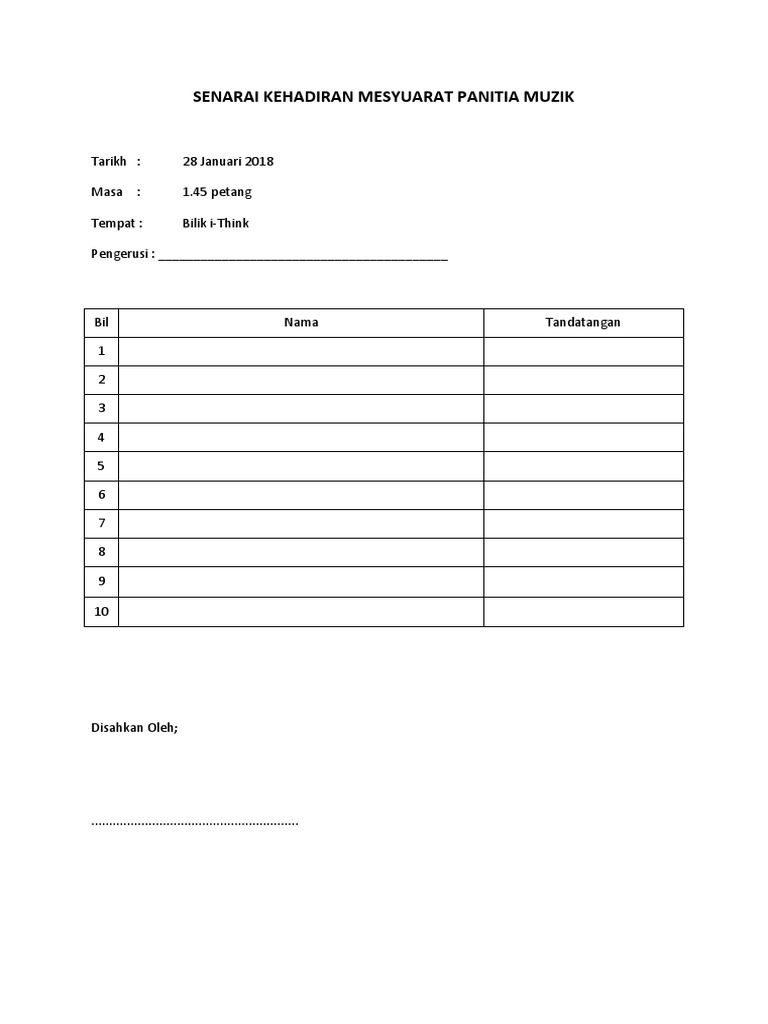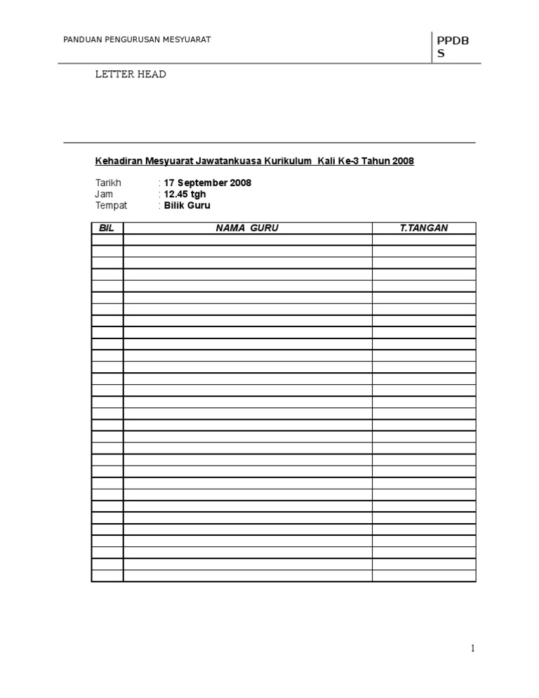 Contoh Borang Kehadiran Mesyuarat Panitia