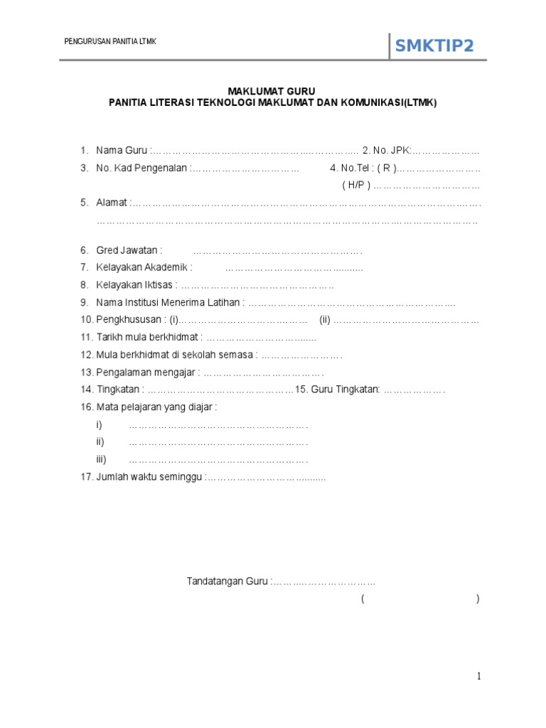Lampiran a sektor pengurusan akademik pejabatpendidikan daerah maklumatgpk 1 nama penuh no ic no hp gred subjek mengajar bil nama guru gred no. Ic jawatan dalam panitia opsyen bukan opsyen pengalaman mengajar kelas mengajar gc ju pemeriksa kertas pt3 spm stpm pengalaman pemeriksa kertas no tel 1 2 3. Simpan simpan contoh borang biodata guru untuk fail panitia untuk nanti. Dengan adanya garis panduan ini diharapkan panitia panitia yang diwujudkan di.