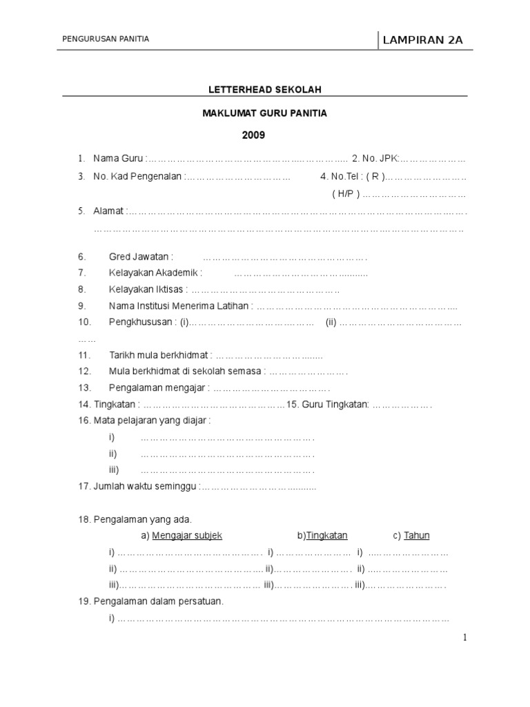 Contoh borang maklumat peribadi guru. Dengan adanya garis panduan ini diharapkan panitia panitia yang diwujudkan di. Malahan fail panitia ini boleh dijadikan salah satu eviden bagi skpmg2 3 1 pengurusan kurikulum di bawah aspek pengurusan mata pelajaran. Borang maklumat diri panitia 2015. Kalau sesiapa nak download boleh download disini terima kasih.