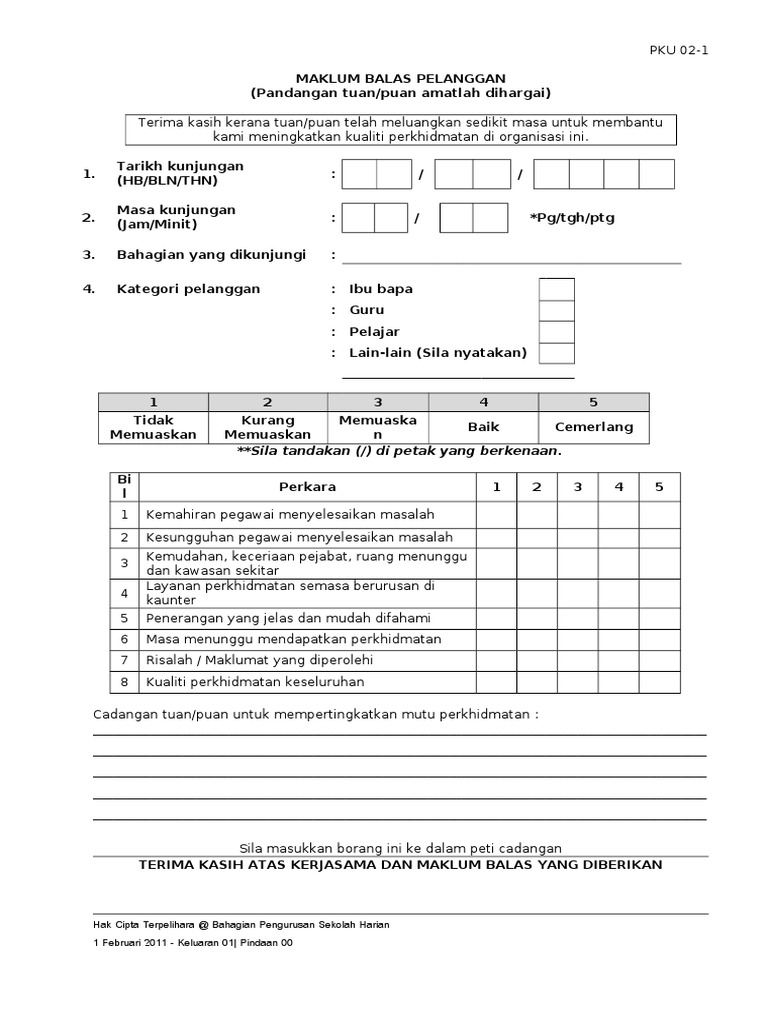 Borang cadangan maklumbalas pelanggan. Tuan puan yang dihormati sila nyatakan kepuasan anda terhadap perkhidmatan berdasarkan panduan seperti berikut. Maklumbalas pelanggan diadakan dua kali setiap semester atau empat kali setahun. Contoh kertas kerja team building.