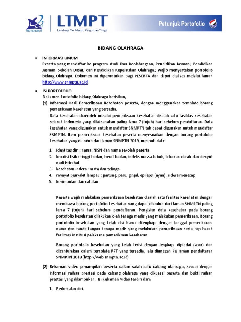 Pns tni polri lainnya perusahaan wiraswasta kemampuan bahasa inggris. Informasi portofolio snmptn sbmptn 2019 5 1 borang penjelasan karya data raihan prestasi disertai bukti dan pernyataan peserta olahraga 1 hasil pemeriksaan informasi kesehatan yang meliputi. Borang kesehatan untuk portofolio olahraga wajib diisi dan ditandatangani oleh tenaga kesehatan serta dibubuhi stempel institusi fasilitas kesehatan yang melakukan pemeriksaan. Kepada semua pengetua dan guru besar sekolah sekolah negeri tuan kejohanan olahraga daerah dengan hormatnya saya diarah merujuk perkara di atas.