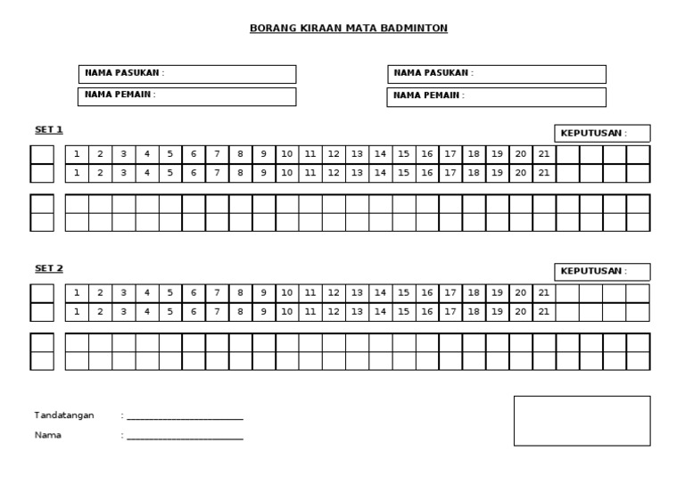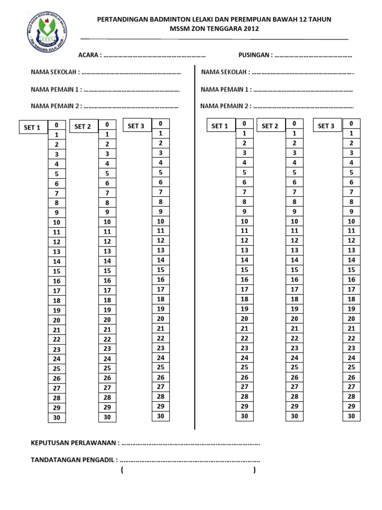Contoh borang pemarkahan badminton. A perseorangan lelaki nama no kad pengenalan 1. Teks pengacara majlis sempena kejohanan sukan tahunan 2017. Unit pemakanan klinik kesihatan seremban. Borang penyertaan karnival kerja raya 2011 badminton nama pasukan.