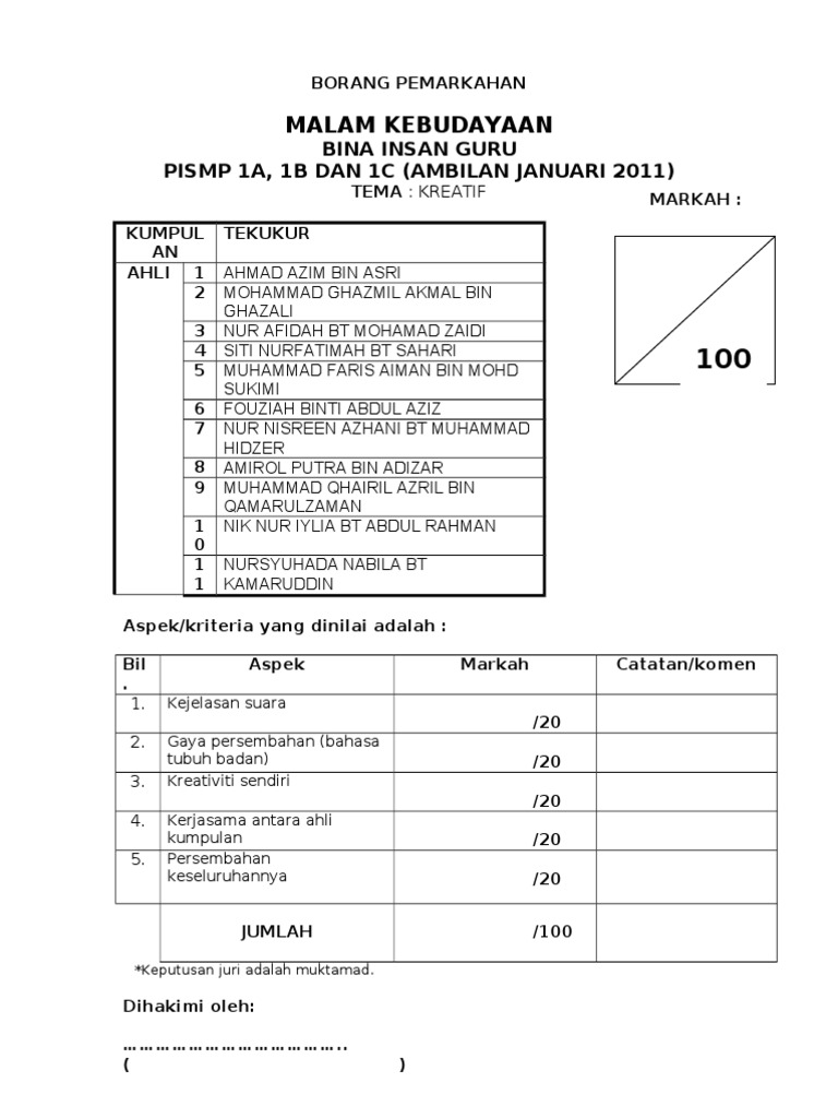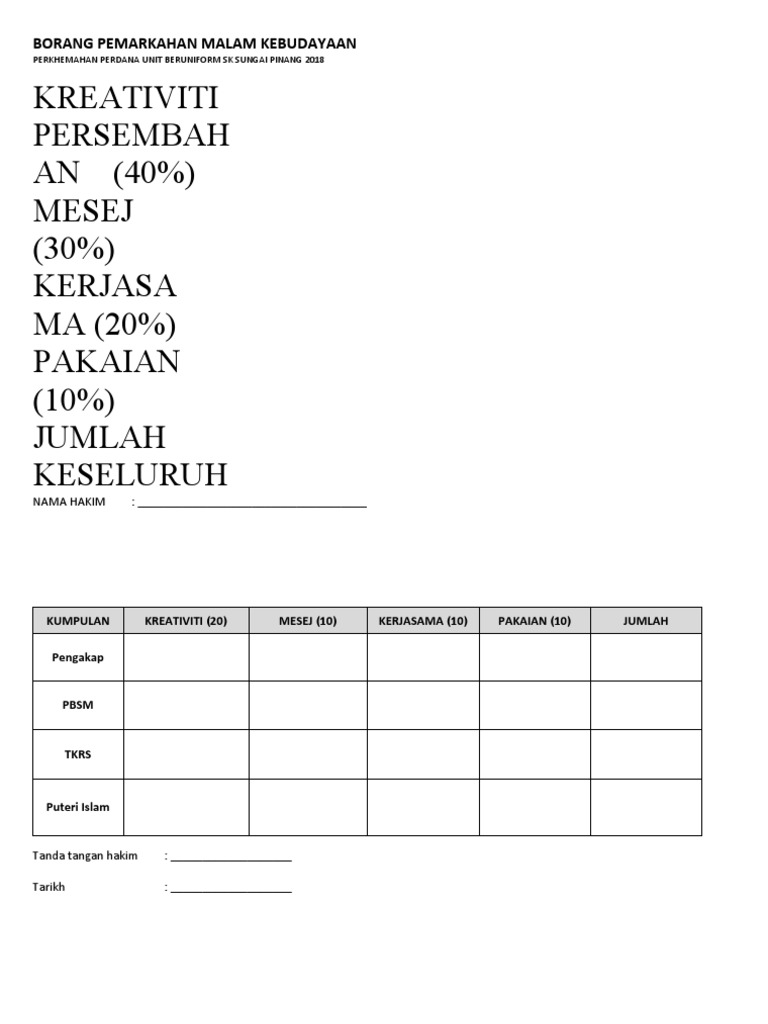 Contoh Borang Pemarkahan Malam Kebudayaan