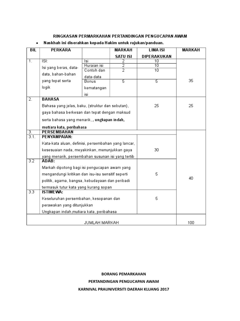 Idea isi 1 idea isi yang bernas kematangan idea. Dengar yang berkesan dan pengucapan awam yang baik tanpa menggunakan teks 3 0 jumlah 100 0 0. Skema pemarkahan kriteria penilaian konvensyen kik jabatan pertanian tahun 2012 kategori. Disokong oleh jeyagobi a l dhamodarem pensyarah penasihat program pertandingan pengucapan awam.