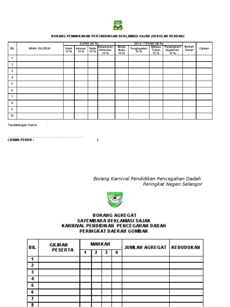 Pertandingan pidato piala kpm. Pertandingan deklamasi puisi teks puisi 2013. Borang pemarkahan pertandingan deklamasi sajak sekolah menengah karnival pendidikan pencegahan dadah peringkat kebangsaan tahun 2008. Sulit borang pemarkahan pertandingan melukis poster antidadah karnival pendidikan pencegahan dadah peringkat daerah jasin 2009 kategori 1 sekolah rendah bil kod nombor peserta tema 15m ilustrasi 25m gubahan komposisi olahan 30m warna bebas 20m kemasan 10m tandatangan hakim.