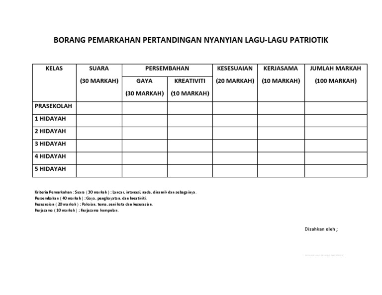 Sekolah kebangsaan ladang kota bahagia 26700 muadzam shah pahang program penghayatan bulan kemerdekaan peringkat sekolah borang pemarkahan pertandingan lagu lagu patriotik suara persembahan kesesuaian kerjasama jumlah kelas 30 markah gaya kreativiti 20 markah 10 markah markah 30 markah 10 markah 100 markah. Lagu lagu pilihan hanyalah dalam bahasa malaysia atau bahasa inggeris sahaja. Borang pemarkahan festival nasyid 3. Pic harmoni bagi peserta solo pic amat dititik beratkan dalam nyanyian dan nada suara bersesuaian dengan lagu manakala bagi peserta berkumpulan harmoni.