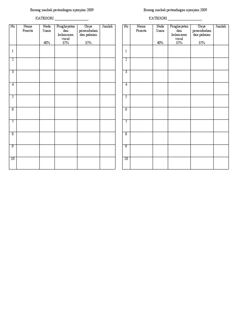 Contoh Borang Pemarkahan Pertandingan Lagu