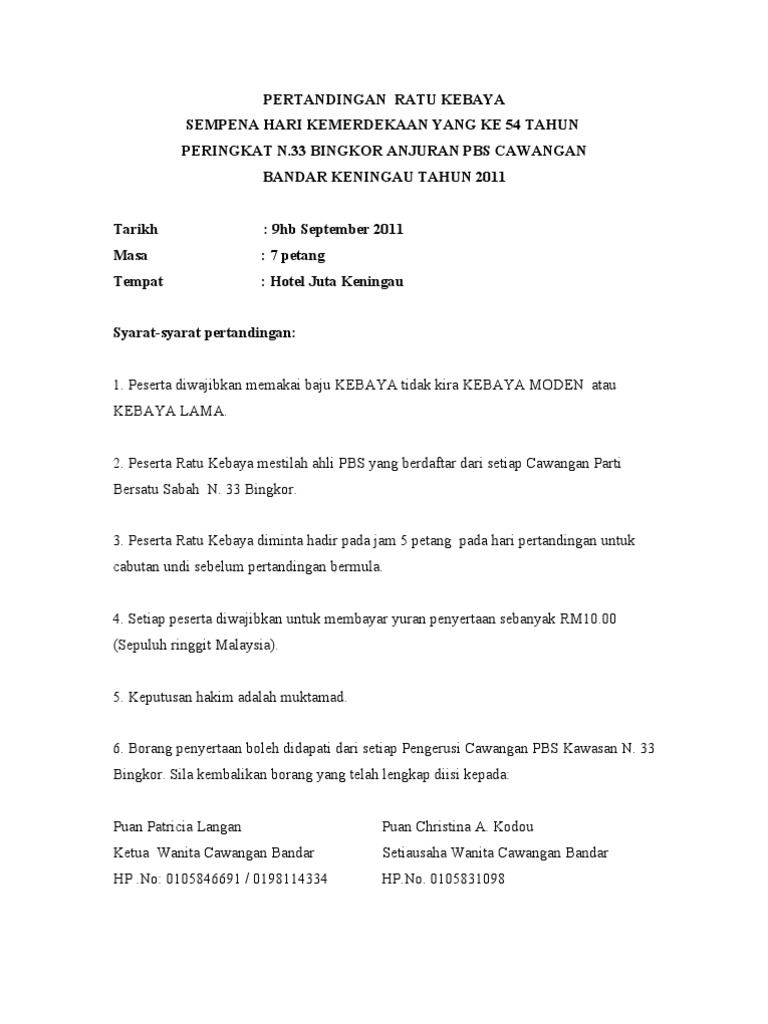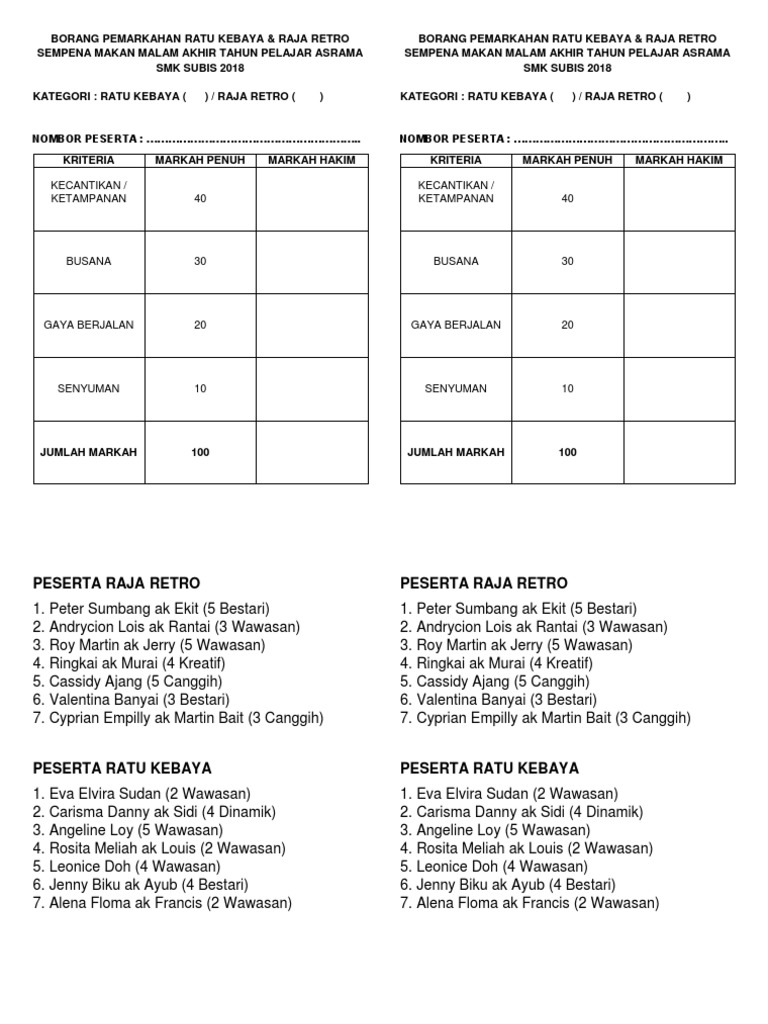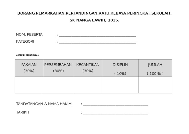 Contoh borang pemarkahan pertandingan ratu kebaya. You are on page 1 of 3. Bahagian aspek dinilai markah diberi a 35 markah patah lagu syair 20 kesempurnaan nada prasa pic 10 syair irama 05 kemanisan kelembutan 20 b 35 markah artikulasi intonasi ala 15 kemerduan suara johor isi tema 05 c 15 markah rima 05 lirik diksi puitis. Pengadil terdiri daripada tiga orang guru di sekoloh ini yang memberi markah dari segi konsep pakaian gaya dan keyakinan kendiri. 0 tukar langkah perlahan 0 1 2 3 3 11.