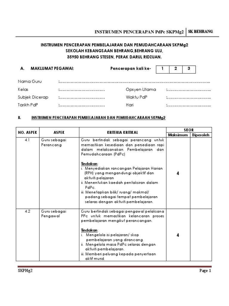 Contoh borang pencerapan guru skpm g2. Ketua polis daerah timur laut komisioner soffian santong berkata guru berkenaan ditemui meninggal dunia kira kira jam 10 35 pagi dalam keadaan terbaring dalam kereta jenis proton saga. Mayat lelaki berusia 43 tahun itu ditemui guru besar yang datang ke rumahnya selepas bimbang sesuatu buruk berlaku kerana dia tidak hadir ke sekolah. Borang pengskoran pdpc standard 4 berikut adalah borang skor bagi pencerapan pdpc yang akan dibuat oleh guru sendiri dan pentadbir sekolah. 28 3 1 2 pengurusan mata pelajaran.