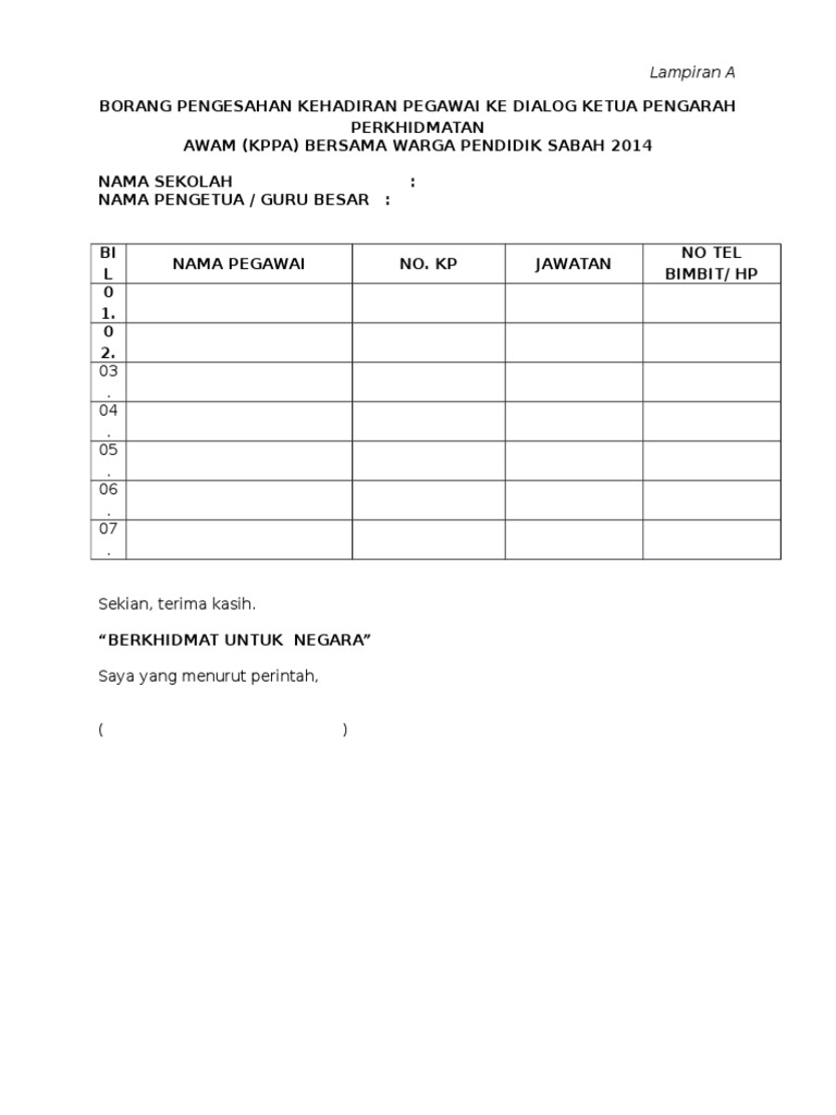 Contoh borang pengesahan kehadiran. Mesyuarat kurikulum bilangan 1 2014. Pk 07 pengurusan menyusarat cop sekolah guru besar gpk 4. Borang pengesahan kehadiran lawatan tapak pengarah institut penilaian negara inspen jabatan penilaian dan perkhidmatan harta persiaran inspen 43000 kajang selangor darul ehsan u p. Kehadiran tuan puan amat dialu alukan dan didahului dengan ribuan terima kasih.