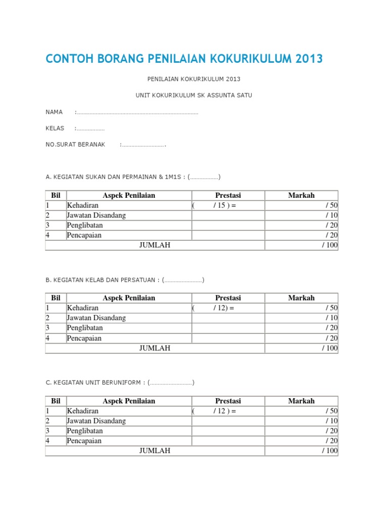 Contoh borang penilaian kokurikulum. Seorang tokoh kurikulum akan dipilih dari kalangan murid tahun 6. Jumlah markah keseluruhan akan dikira oleh ajk penilai yang dilantik oleh pihak sekolah. Harus diingat keberhasilan yang dikongsikan adalah contoh semata mata. Penilaian kokurikulum bahagian sekolah kementerian pelajaran malaysia.
