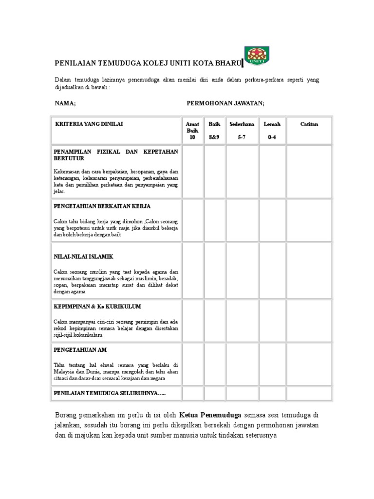 Cari di dalam dokumen. Oleh kerana itu hari ini kami ingin berikan beberapa kaedah yang digunakan oleh panel penemuduga untuk menilai anda semasa anda ditemuduga. Simpan simpan borang penilaian temuduga untuk nanti. Lengkapkan ruangan di bawah dengan maklumat terkini gunakan huruf besar tandakan tb jika tidak berkaitan.