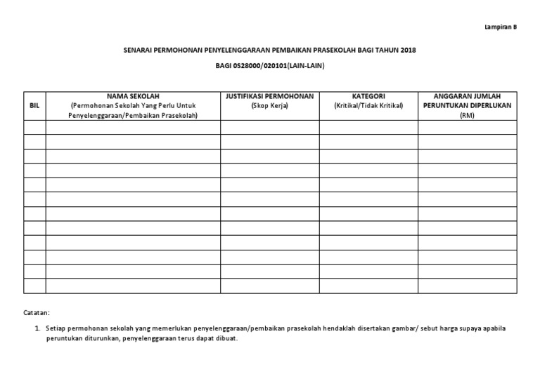Pdf gp peruntukan penyelenggaraan sbk 2020 borang bpa 5 lampiran 1. Maklumat kenderaan dan jabatan diisi oleh jabatan berkenaan jenis no. Tuntutan penyelenggaraan adalah sah bagi peralatan yang mempunyai nombor harta modal sahaja. Borang senarai semak kemudahan dan prasarana janet jouti.