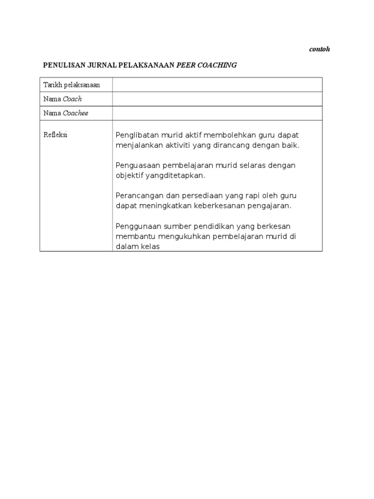 Objektif 1 menerangkan konsep peer coaching dalam plc. Mengamalkan tiga proses utama dalam model pengajaran model lesson pra konferensi pemerhatian dan pasca konferensi 3 mengenal pasti ciri ciri coach yang baik dalam melaksanakan model pengajaran model lesson. Dijemput oleh pihak sekolah tersebut melalui seorang kenalan guru di sana bagi menyertai program plc professional learning communities strategi yang dipilih adalah peer coaching di mana seorang guru mengajar dan guru guru lain memerhati dan berkongsi pengetahuan. Contoh laporan plc teacher sharing jurnal peer coaching dalam entri saya yang sebelum ini strategi tips borang pelaksanaan plc saya sudah kongsikan senarai borang yang perlu ada dalam laporan plc bagi setiap strategi yang dijalankan.