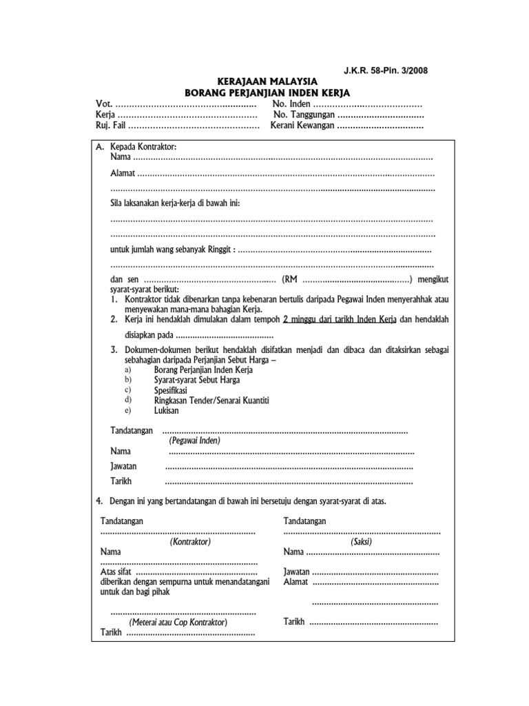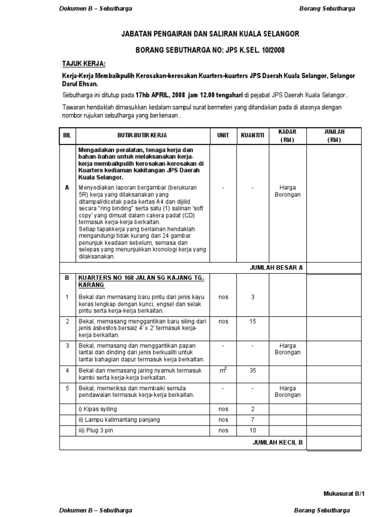 Contoh borang sebutharga jkr. Tempoh dan tandatangan dalam borang sebutharga c senarai kerja dalam tangan d jadual kadar harga jika ada e butir butir spesifikasi jika ada f lampiran jika berlaku kesilapan dalam mengisi maklumat. Machang dengan kiriman wang pos yang dibuat atas nama pengarah jkr kelantan sebagai bayaran dokumen sebut harga. Sebahagian daripada perjanjian sebut harga a borang perjanjian inden kerja b syarat syarat sebut harga c spesifikasi d ringkasan tender senarai kuantiti e lukisan. Tawaran iklan sebut harga yang dipaparkan adalah merupakan dokumen yang dikeluarkan oleh pejabat pejabat bahagian cawangan di ibu pejabat jkr johor dan jkr daerah di johor mengikut tarikh iklan yang masih dalam tempoh penjualan.
