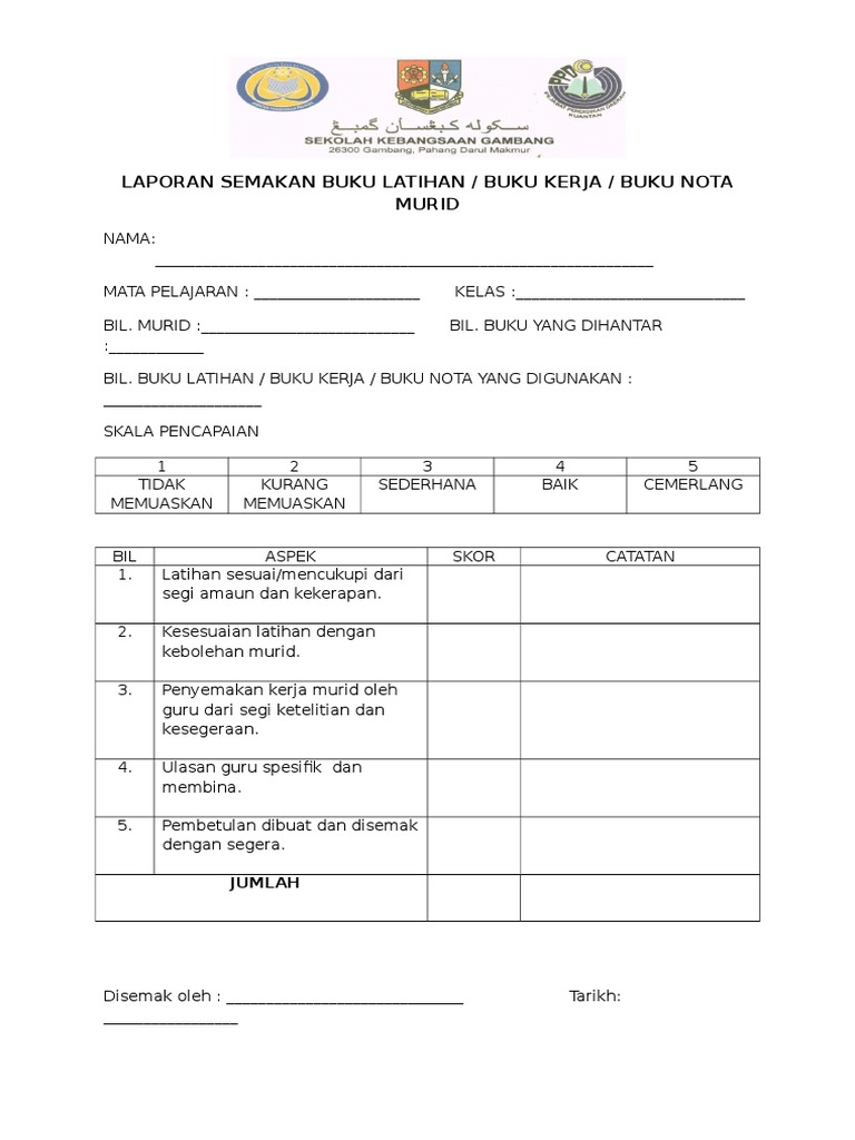 Contoh Borang Semakan Buku Latihan Murid