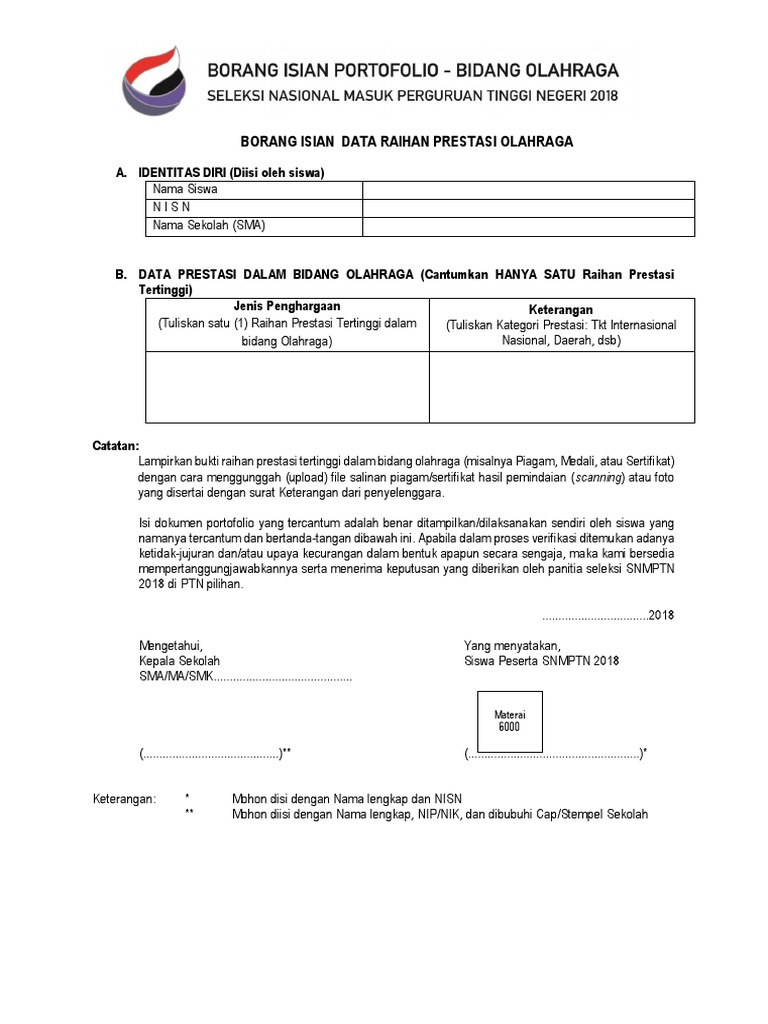 Kondisi fisik riwayat penyakit catatan khusus jika ada dan pernyataan sehat tidak sehat pemeriksaan dilakukan oleh tenaga. Daftar borang isian portofolio olahraga. Berikut merupakan tampilan pernyataan kesungguhan untuk mendaftar snmptn. Tampilan formulir online borang pendaftaran sbmptn 2014.