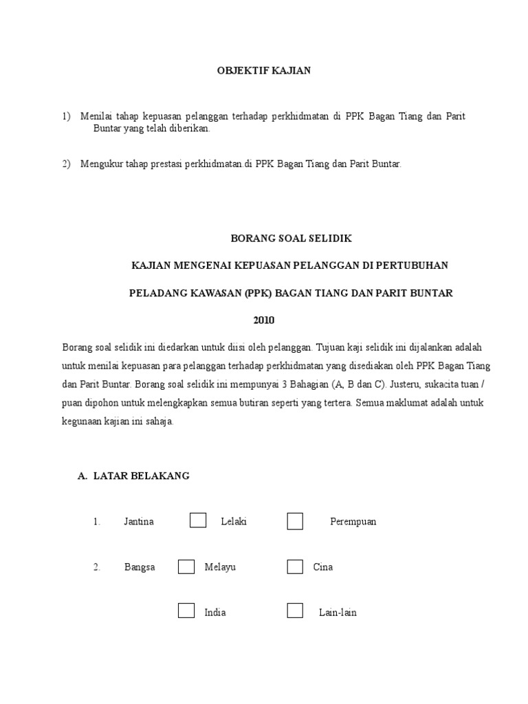 Related posts to contoh borang soal selidik kepuasan pelanggan terhadap perkhidmatan bank contoh borang soal selidik kepuasan pelanggan terhadap perkhidmatan bank 2016 12 06t13 38 00 08 00 rating. Soal selidik ini bertujuan untuk mendapatkan maklumat yang diperlukan bagi menilai keberkesanan mpsp dalam memberi perkhidmatan yang berkualiti. Tarikh kaji selidik ini dijalankan dari 21 disember 2015 hingga 31 disember 2015. Borang soal selidik kajian kepuasan pelanggan terhadap perkhidmatan kaunter unit hasil utama hospital sungai buloh para pelanggan yang dihormati.