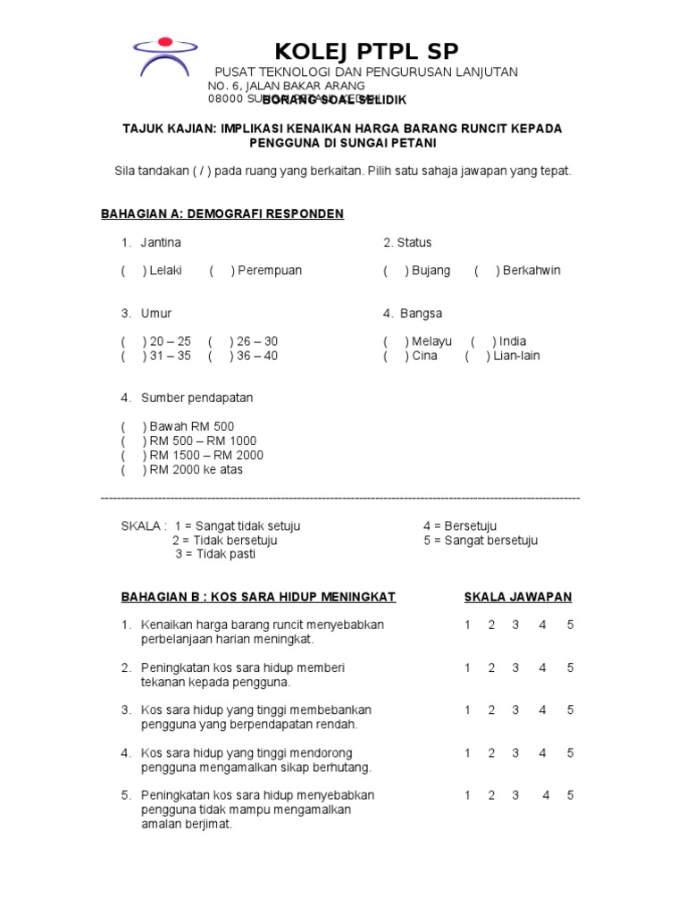 Contoh borang soal selidik tentang kes pengangkutan wall ppx source. Sebagai konsep pengukuran prestasi kerja keberke sanan penilaian prestasi boleh dinilai dengan menggunakan petunjuk kecukupan pengu kuran seperti kesahan kebolehpercayaan ketepatan kesilapan psikometrik dan keprak tisan landy dan farr 1983 danjacobs et at. Borang soal selidik telah diedarkan kepada responden 205 borang soal selidik atau 79 berjaya dikumpulkan dan digunakan dalam analisis statistik. Sila berikan jawapan anda mengikut skala yang diberikan di ruang sebelah.