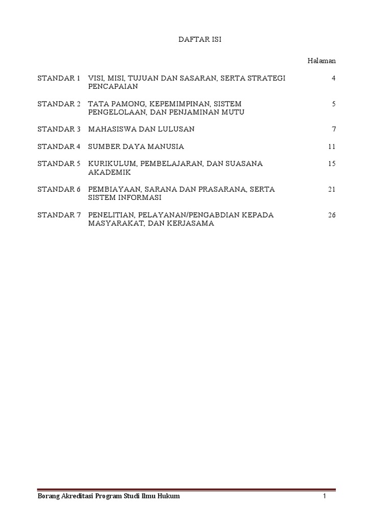 Penelitian pelayanan pengabdian kepada masyarakat dan kerjasama borang akreditasi institusi upn veteran yogyakarta tahun 2013 394 7 1 4. Borang institusi universitas prof. Borang unit pengelola program studi magister fakultas teknik unsri iii daftar isi halaman standar 1 visi misi tujuan dan sasaran serta strategi pencapaian 1 standar 2 tata pamong kepemimpinan sistem pengelolaan dan penjaminan mutu 1 3 standar 3 mahasiswa dan lulusan 3 8 standar 4 sumber daya manusia 4 6. 7 terwujudnya suasana akademis yang baik dalam mendukung proses.