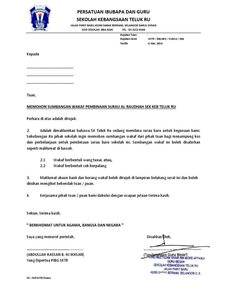 Pihak surau al faizin melalui ahli jawatankuasanya sedang mengedarkan borang maklumat penduduk islam ke setiap rumah orang islam di taman serai permai ini. Contoh surat permohonan bantuan surat permohonan bantuan umumnya dibuat ketika tidak bisa memenuhi kebutuhan secara mandiri. Prosedur kutipan saham wakaf selangor wakaf khas pembukaan akaun wakaf khas merupakan kaedah untuk mengutip dana wakaf yang diberikan kebenaran dari pihak perbadanan wakaf selangor bagi pembangunan dan pembinaan masjid dan surau yang tidak termasuk di dalam rancangan malaysia rmk. Yang mana wakaf tanah tersebut dipergunakan untuk tujuan di bidang sosial kemanusiaan dan keagamaan.