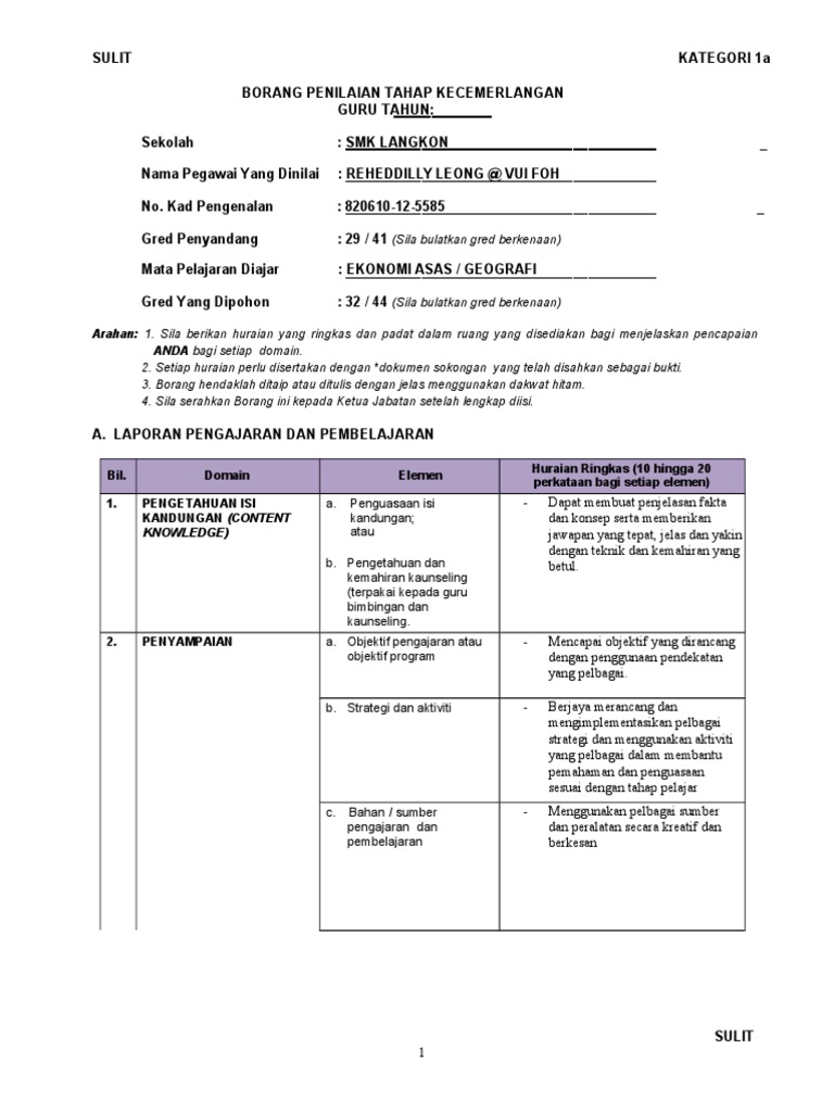 Contoh mengisi borang penilaian tahap kecemerlangan guru 1a. 29 41 sila bulatkan gred berkenaan mata pelajaran diajar. Sulit kategori 1a borang penilaian tahap kecemerlangan. Sekolah kebangsaan sungai nibong nama pegawai yang dinilai. Sulit kategori 1a borang penilaian tahap kecemerlangan pdf meta data.