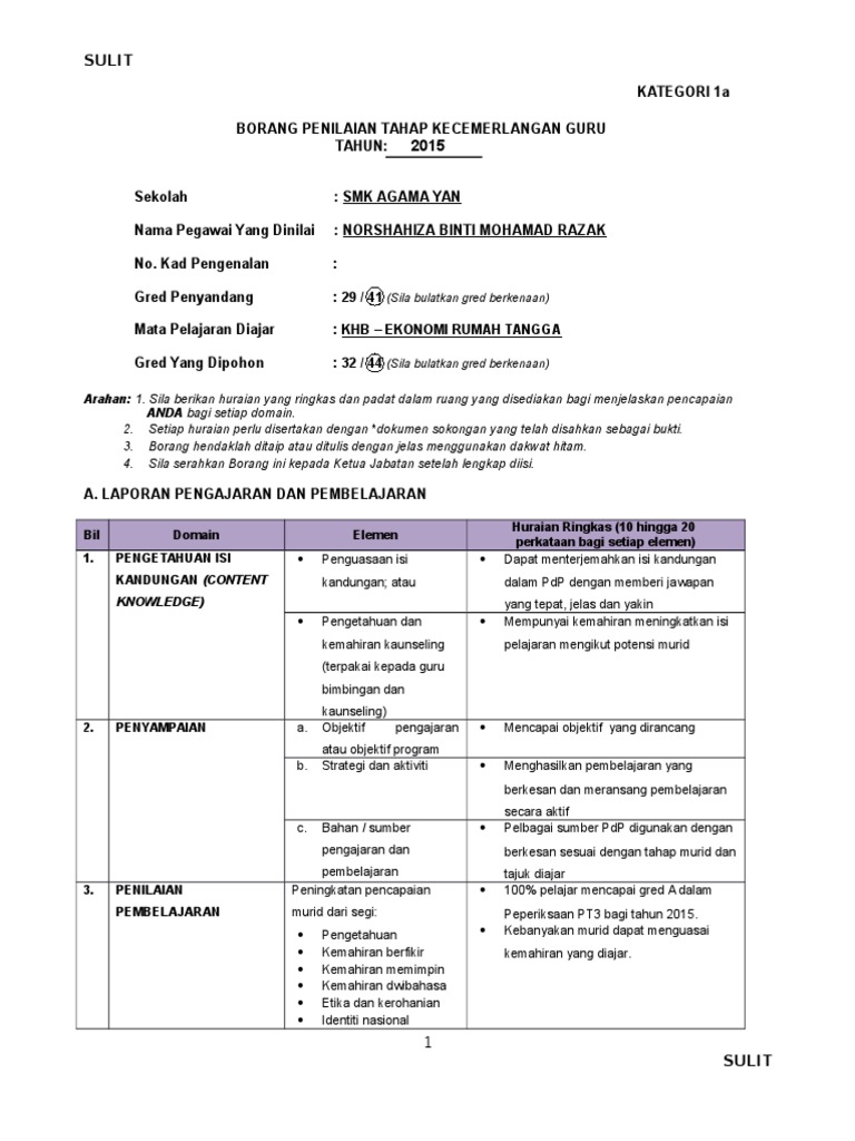 Mazlan bin abd malek no. Kategori 1a contoh. Bahasa inggeris gred yang dipohon. Sulit kategori 1a borang penilaian tahap kecemerlangan guru tahun.