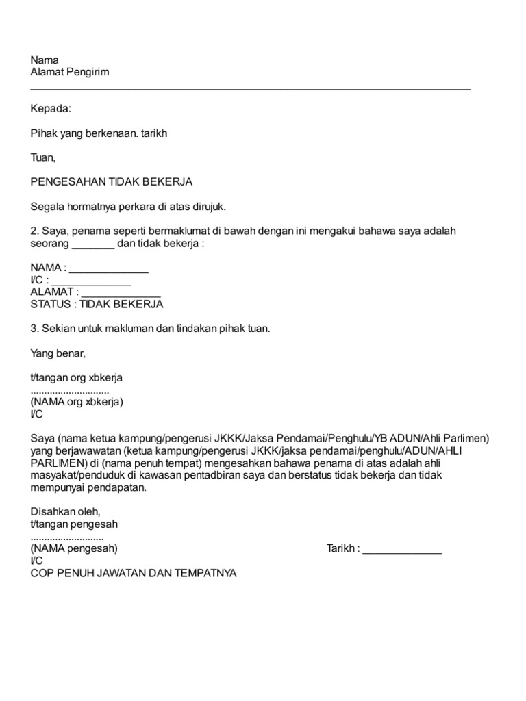 Contoh surat pengesahan pendapatan ibu bapa tidak bekerja. Beberapa contoh surat pengesahan dari penghulu terbaru 2019. 27050 hits assalamualaikum hari ni saya nak kongsi sedikit panduan menulis surat pengesahan tidak bekerja untuk permohonan penangguhan bayaran balik ptptn sesetengah daripada kita bukan tak nak bayar balik pinjaman ptptn ni tapi masalahnya masih belum. Dengan ini mengesahkan bahawa saya bekerja sendiri tidak bekerja sebagai. Contoh surat pengesahan dari penghulu have a graphic associated with the other contoh surat pengesahan dari penghulu in addition it will feature a picture of a sort that could be seen in the gallery of contoh surat pengesahan dari penghulu.