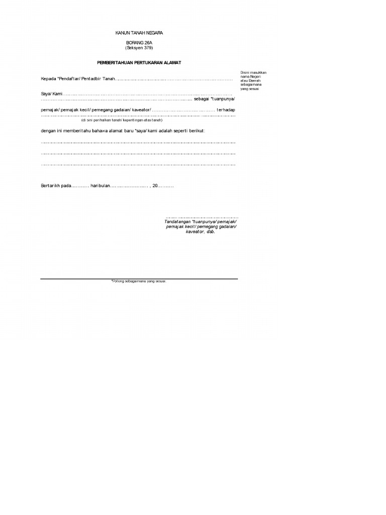 Nama borang dokumen form document name penerangan description 1 borang 12a. Hakmilik kepentingan tanah saya kami adalah seperti memberitahu bahawa alamat baru berikut bertarikh pada. Senarai semak permohonan perintah jualan. Kanun tanah negara borang 26a seksyen 379 pemberitahuan pertukaran alamat kepada pendaftar pentadbir tanah.