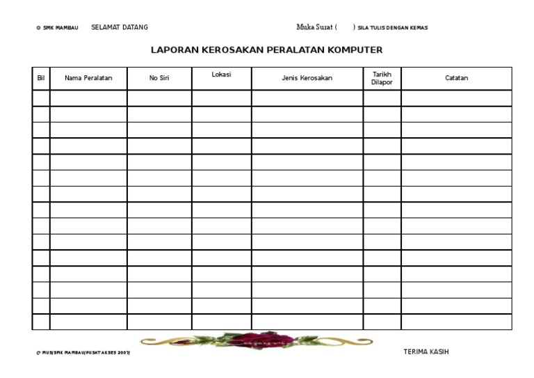 Maklumat kerosakan diisi oleh pelapor kategori masalah jenis perkakasan aplikasi terlibat perkakasan jenama model no siri perisian sistem aplikasi lain lain keterangan. Pekeliling perbendaharaan malaysia am 2 4 lampiran b nota. Borang pengurusan aduan masalah kerosakan peralatan ict untuk kegunaan kakitangan bahagian perkhidmatan farmasi membuat aduan masalah kerosakan ict hak milik kerajaan. Maklumat kerosakan maklumat kerosakan diisi oleh pelapor kategori masalah keterangan kerosakan c pu.