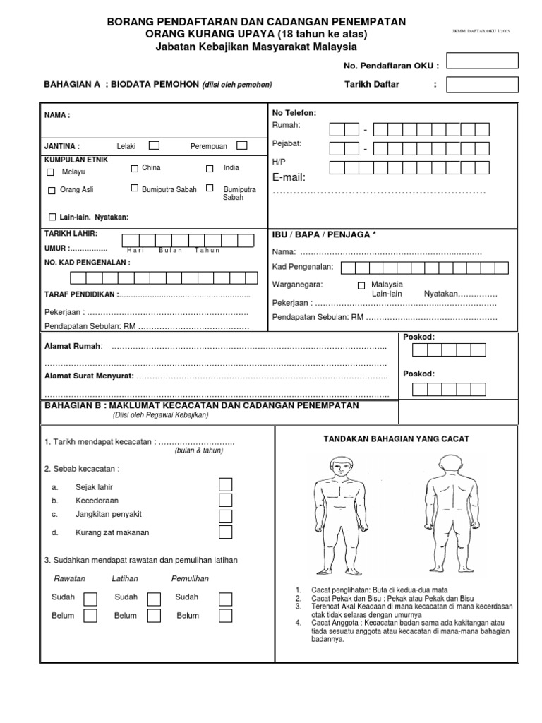 Borang permohonan bantuan jabatan kebajikan masyarakat kategori permohonan baru 1. Jabatan kebajikan masyarakat malaysia aras 6 9 18 no 55 persiaran perdana presint 4 62100 putrajaya. Borang yang telah lengkap diisi perlu dihantar ke pejabat kebajikan masyarakat daerah jajahan bahagian di mana pemohon tinggal bersama salinan dokumendokumen sokongan. Berikut adalah maklumat berkaitan kategori oku jenis panduan dan syarat syarat pendaftaran serta manfaat yang layak diterima oleh oku yang berdaftar.