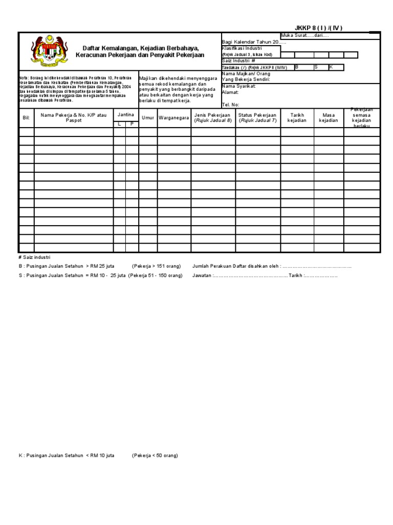 Panduan mengisi borang jkkp 8 panduan mengisi borang jkkp 9 10 content table 1 2 table 3 table 4 5 7 table 6 table 8 table 9 table 10 table 11 table 12 table 13 table 14 table 15 table 16. Borang ini dikehendaki di bawah peraturan 10 peraturan keselamatan dan kesihatan pemberitahuan. Best viewed 1280 x 1024 using google chrome version 57 0 mozilla firefox version 52 0 modified date. Jkkp 8 iii iv bilangan yang maut 20 jumlah.