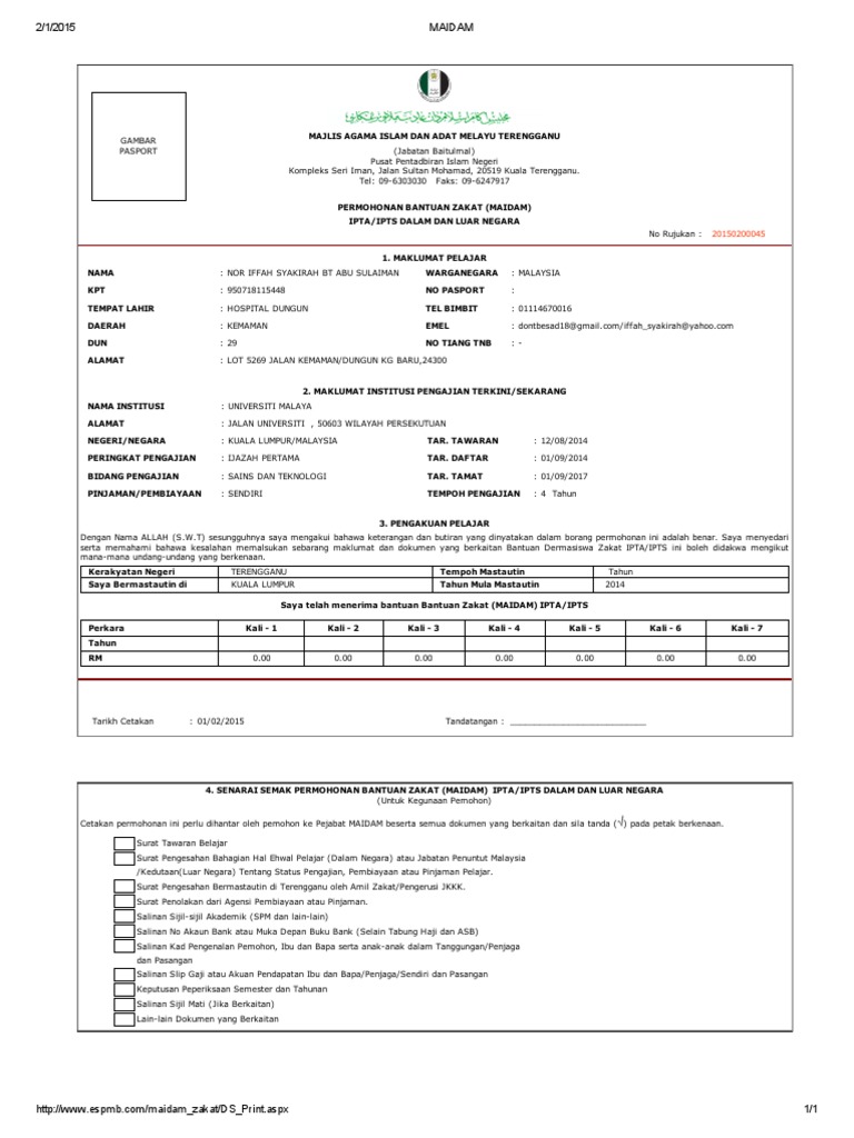 Layari laman maidam terengganu. Semakan borang permohonan zakat maidam terengganu 2020 dari bantuan majlis agama islam terengganu sebenarnya kita sangat beruntung jadi anak malaysia. Saya menyedari serta memahami bahawa kesalahan memalsukan sebarang maklumat dan dokumen yang berkaitan bantuan zakat ipta ipts ini boleh didakwa mengikut mana mana undang undang yang berkenaan. Dengan nama allah s w t sesungguhnya saya mengaku bahawa segala keterangan dan butiran yang dinyatakan dalam borang permohonan ini adalah benar.