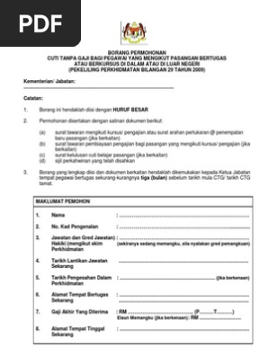 Pekeliling perkhidmatan bilangan 5 tahun 2016 dasar baharu cuti tanpa gaji bagi pegawai yang mengikut pasangan bertugas atau berkursus di dalam atau di luar negara tujuan 1. Pekeliling perkhidmatan bilangan 29 tahun 2009 cuti tanpa gaji bagi pegawai yang mengikut pasangan bertugas atau berkursus di dalam atau di luar negeri tujuan 1. Borang ini hendaklah diisi dengan huruf besar. Lampiran a cuti tanpa gaji mengikut pasangan bertugas atau berkursus di dalam atau di luar negara pekeliling perkhidmatan bil 1 92 dan bil 14 2005.