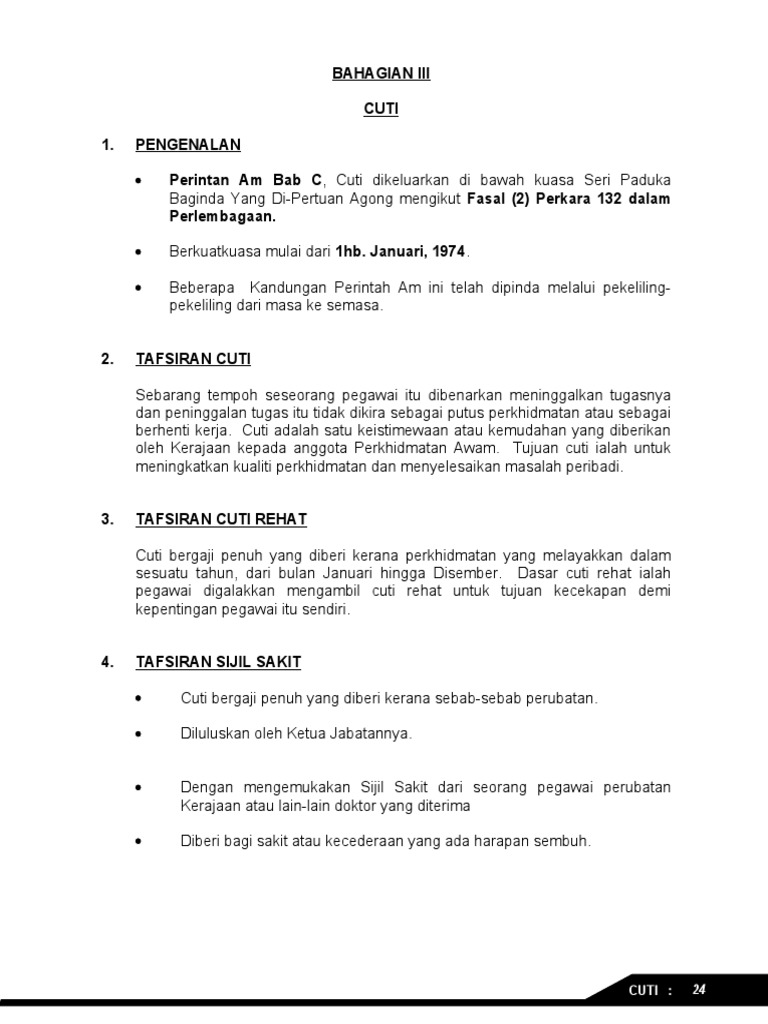 Pekeliling perkhidmatan bilangan 2 tahun 2006 pindaan peraturan berkaitan penerimaan sijil sakit swasta untuk tujuan kemudahan cuti sakit created date. Jpa sulit np 134 1 klt 13 21 bertarikh 6 mac 2007 adalah dibatalkan. Cuti rehat dan cuti sakit dan bagi guru termasuk cuti sekolah bergaji penuh tetapi tidak termasuk cuti separuh gaji cuti tanpa gaji cuti haji cuti sakit tibi kusta dan barah dan cuti. Bagi maksud surat pekeliling perkhidmatan ini senarai cuti bergaji penuh cuti separuh gaji dan cuti tanpa gaji yang sedang berkuat kuasa bagi pegawai lantikan tetap adalah seperti di lampiran b.