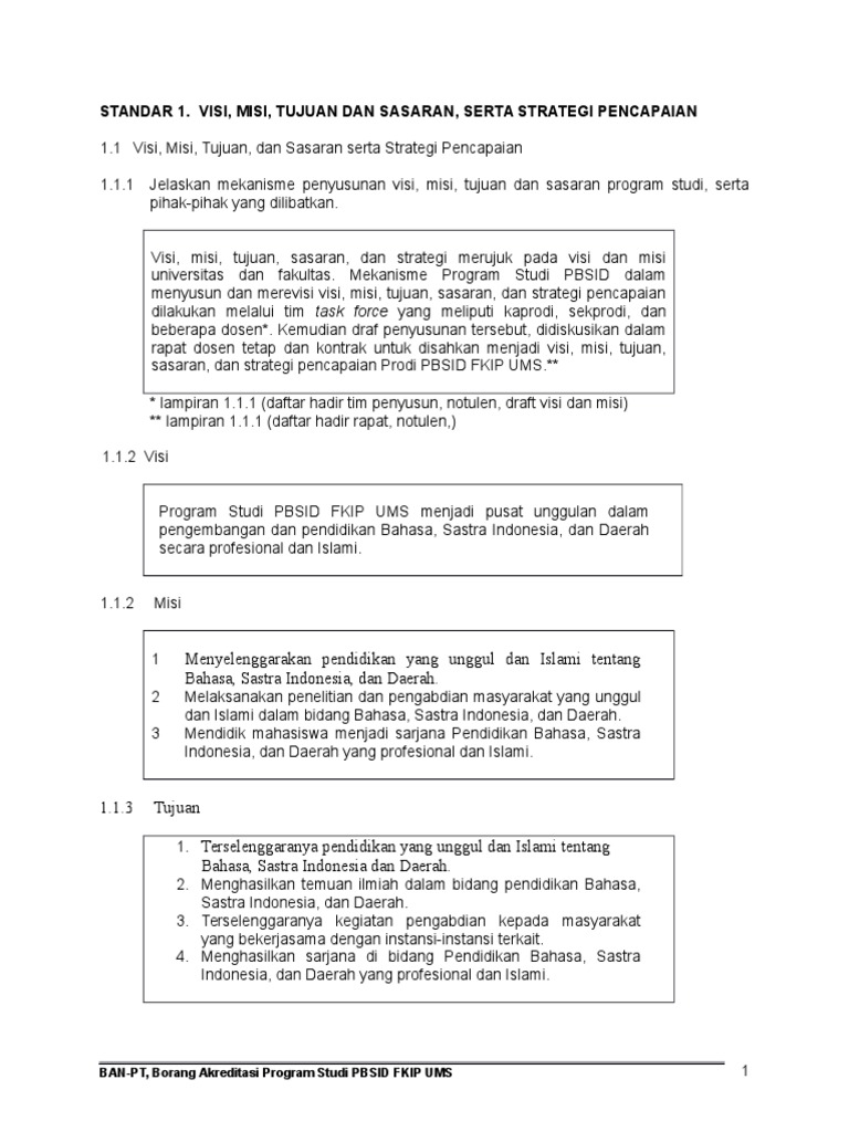 Yang memperoleh nilai akreditasi a 0 0 37 50 45 62 50 3 meningkatnya persentase program studi yang memperoleh nilai akreditasi b. Penyajian data dan pengisian borang akreditasi dan evaluasi diri bagi institusi dan setiap program studi juga merupakan wujud pertanggungjawaban hasil kerja institusi dan program program studi yang ada unpatti pada tahun 2009 yang dilanda konflik sosial maluku telah berupaya melaksanakan. Standar 3 mahasiswa dan lulusan 3 1 mahasiswa. Borang akreditasi institusi institusi perguruan tinggi 2011 1 1 3 sosialisasi visi misi tujuan sasaran dan strategi pencapaian dan penggunaannya sebagai acuan dalam penyusunan rencana kerja institusi pt.
